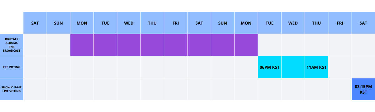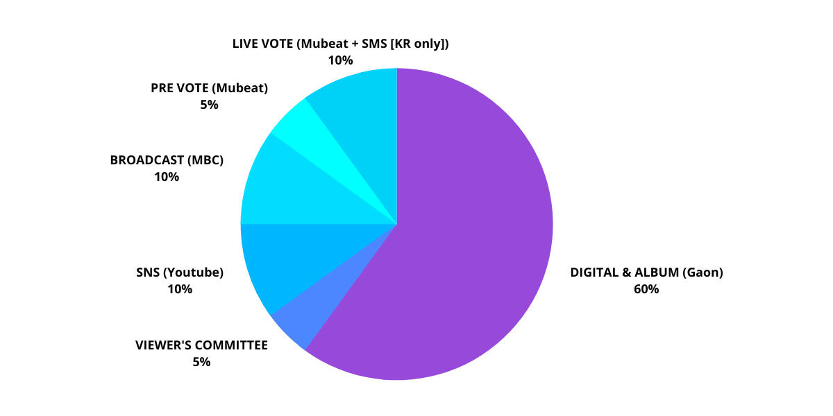 Broadcast - Based on their respective broadcasting stations. The artist's score depends on how many times their song were featured or play in their radio and TV shows. Also based on content uploaded on their respective channels such as comeback stages, fancams, performance videos, and etc.